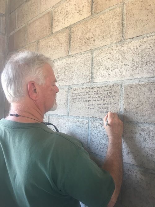 Dr. Johnny writing John 13:34-35 on a new church meeting house that was dedicated today. Adam was asked to preach at the dedication service.